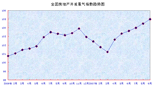 中新網10月26日電 國家統計局網站今日公布的數據顯示,9月份,“國房景氣指數”為104.99,比8月份上升0.51點,同比上升1.85點。