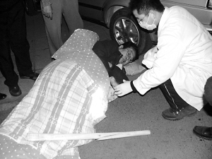 前晚,楊兆瑞遭襲后倒地無法動彈,醫務人員到場救治。傷人者使用的木棍已經斷裂,扔在一旁。(圖片來源:新京報 九龍山莊業主供圖)