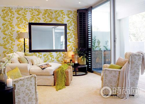 地板與墻壁的顏色,永遠是房間內值得細細斟酌的搭配游戲。上來便確定了混入黃色的綠調,可以使氣氛看起來單純又有活力。墻壁上蜿蜒的藤蔓一字排開,圖案舒展而飽滿,中間的鏡子大面積提升了房間的明亮感;而地板只選了干凈的純色作為映襯,主次分明。
