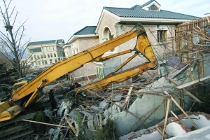 液壓剪拆除完地面部分后,液壓錘上場(chǎng)。長(zhǎng)達(dá)1米的鋼鉆頭敲向地下室的天花板,散落的水泥塊和鋼筋掉到地下室內(nèi)。這些水泥塊和鋼筋將直接用來回填地下室,以防止再次擴(kuò)建。