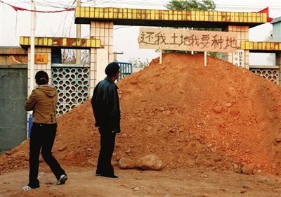 認(rèn)為村委會未按照占地時的承諾為其置換土地,14日晚,村民靳先生雇車運來黃土,堵住豐臺區(qū)長辛店鎮(zhèn)大灰廠村村委會的大門。