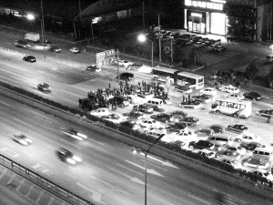 事發惠新東橋與望和橋之間的北四環外環主路。“四環上全是車,生生被一座人墻給截住了。”前晚10時許,芍藥居北里的雷先生在自家陽臺看到了這樣的場景。他介紹,當時有數十人站在北四環53號小營路出口旁,將東向西主路的五條車道幾乎全部堵死。五分鐘內,上百輛經過此地的轎車、機場巴士和商務客車被攔截在他們面前,喇叭聲和叫嚷聲不時響起。幾名司機下車理論后,人群讓出了最內側一條車道,車流緩慢通行。