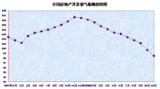 中新網(wǎng)12月12日電 中國信息報今天刊出了國家統(tǒng)計局月度形勢報告《2008年1-11月全國房地產(chǎn)市場運行情況》。月度報告指出,11月份,全國房地產(chǎn)開發(fā)景氣指數(shù)(簡稱“國房景氣指數(shù)”)為98.46,比10月份回落1.22點,比去年同期回落8.13點。
