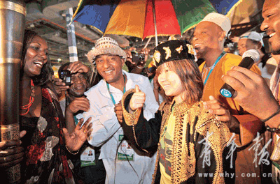記者看到,吳晶在數十位非洲朋友與無數閃光燈的熱情招呼下,一開始還不明白究竟發生了什么事情。在儀式結束后她才定下心來對記者表示,非洲館是她今天去的第一個展館,真是沒想到會給自己帶來如此驚喜。