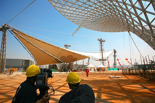 中新網4月30日電 據上海世博會官方網站消息,今天,世博軸上首批兩個喇叭狀的陽光谷正式落成,同時頂棚膜結構張拉啟動,這標志著世博軸上部主體工程即將全面完工。上海世博會執委會專職副主任鐘燕群、上海世博局副局長丁浩等出席儀式。鐘燕群宣布啟動世博軸頂棚膜結構張拉。