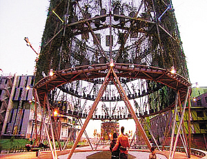 說起城市的標(biāo)志性建筑,你的腦海中或許會閃現(xiàn)埃菲爾鐵塔、自由女神、悉尼歌劇院、東方明珠、迪拜塔……而對于西班牙馬德里來說,則是竹屋和“氣候樹”。竹屋原是政府提供給低收入人群居住的廉租屋,但它獨特的設(shè)計為居住者創(chuàng)造了一種“回歸自然”的原生態(tài)氛圍。“生態(tài)氣候樹”則是馬德里生態(tài)大道三座圓柱形鋼結(jié)構(gòu)建筑之一。“樹”上安放了各種綠色植物,“樹”頂安裝有太陽能電池板。一到夜間,此處就成了音樂的天堂,白天儲存的電力完全可以滿足照明、音響的需要。在世博城市最佳實踐區(qū)北部街區(qū),設(shè)計師將把這兩個建筑的精髓呈現(xiàn)給參觀者。