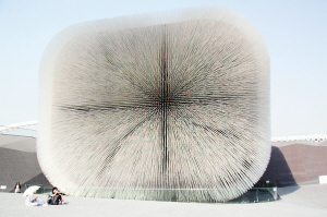 記者:我現在就在英國館外大概50米左右的地方,英國館占地6千平方米,是最大的自建館之一,在英國館的入口處外墻上印了這么一句話,“英國館就是英國送給中國的禮物”。為什么這么說呢,因為整座的英國館的外墻就像一個剛剛打開的精致禮品包裝盒,種子圣殿就是禮物本身,在外面的露天廣場則是剛剛取開的包裝紙,游客們可以在上面休息,孩子們可以在上面嬉戲。