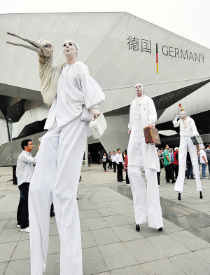 素來以穩重、嚴謹著稱的德國人把一座“懸浮在空中的建筑”帶到了上海世博園區,但當看上去不穩的德國館建筑單體構成一個平穩的整體時,卻強烈地表現出“和諧都市”的主題。今天上午,德國館迎來國家館日。德國館日的活動精彩紛呈。中午時分,在世博軸陽光谷,歐洲青年交響樂團精彩的演奏以及德國嘻哈樂隊的節奏音樂口技和嘻哈表演輪番上場,德國樂隊“兩居室”則為觀眾帶來最新流行樂曲。而在德國館外排隊等候的人群中,扮相奇特的“巨人”不時與游客打個招呼,帶來陣陣笑聲。