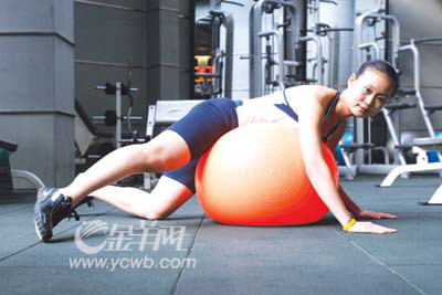 趴在健身球上,抬起一條腿,在空中往上畫半圓。左右各做15~20次。