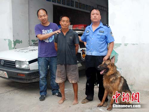 中新網周口8月6日電(記者 齊永 )一個多月前,鄲城縣虎崗鄉梁老家行政村村民王某在焦作市殺人后畏罪潛逃。而令他十分費解的是其剛在老家附近出現就被聞訊趕到的鹿邑警方緝拿歸案,況且還是栽倒在一條神奇的警犬手里。8月5日,在王某被移交給焦作警方時仍是一臉的沮喪和不解(如圖)。