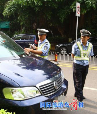 據在現場的市民李先生介紹,昨日上午,他和朋友開車到古玩一條街閑逛,可因前方堵車,一直無法進入,李先生隨即下車走到路口發現,原來有兩輛軍車和一輛省政府公務車違規在路邊停車,導致交通堵塞。就在車主們焦急等待的時候,?诮痪皶r趕來,疏導了現場的交通后,毫不猶豫地對這些違規停車的“特權車”及其他私家車開出罰單。(國際旅游島商報 記者王煥娟特約記者李順成攝影報道)