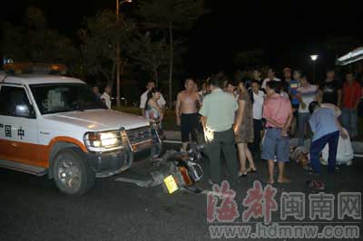 事發8月17日晚近10時,黃先生說:“太突然了,我一下被撞飛,當時馬上暈過去了。”當晚,他和幾個同事在江濱路大排檔吃完飯后,分乘兩輛摩托車沿江濱路由東往西行駛,他開的摩托車上載著同事周女士。途經洋老洲游泳池附近時,黃先生突然感到后面有車撞來,他和周女士被撞倒并被往前面推行了10多米,接著他就暈過去了。