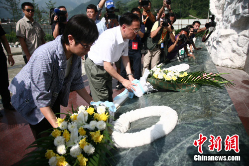 中新網(wǎng)都江堰7月27日電(劉賢 張浪)27日,曾蔭權(quán)率領(lǐng)的香港特區(qū)政府代表團(tuán)抵達(dá)四川地震災(zāi)區(qū)汶川。在參觀完香港援川項(xiàng)目以后,曾蔭權(quán)一行隨即來到漩口中學(xué)地震遺址,向汶川大地震遇難者和在抗震救災(zāi)中英勇犧牲的烈士默哀鞠躬,獻(xiàn)花祭奠。