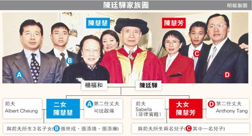 至于其妹陳慧慧,近年已出任南豐集團(tuán)董事長(zhǎng)兼董事總經(jīng)理,她與前夫所生的3名子女張世成、張?zhí)礴蠛蛷執(zhí)砹站完懤m(xù)加入南豐管理層,在陳廷驊在2008 年退休之后,其家庭勢(shì)將接掌整個(gè)南豐王國(guó)。其母楊福和日前于入稟狀就指出,陳慧慧于2003至2005年曾向父親作出虛假陳述,以致出現(xiàn)家族財(cái)產(chǎn)轉(zhuǎn)移,但當(dāng)中未有透露具體與哪些財(cái)產(chǎn)有關(guān)。