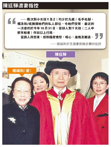 至11月9日,楊福和第二次要求提交補充資料,指陳廷驊今年10月底與女兒及兩名曾孫女出席萬圣節派對,于車上曾撫摸兩名曾孫女的“私人部位”,“令她們受驚”,楊福和得悉事件后感到“極度憤怒,嘔心,羞愧及難過”。家事法庭法官拒絕楊福和第二次提交的補充資料,楊不服向高院上訴,上訴庭昨日頒下判辭駁回上訴之余,也揭露了楊針對丈夫的指控。