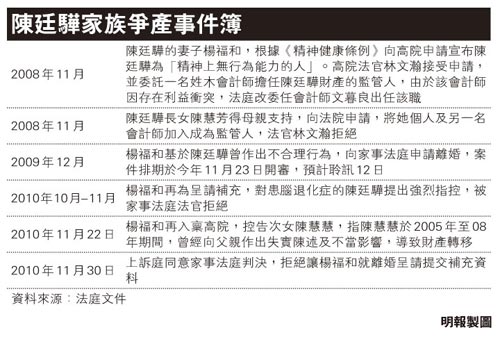 陳廷驊的86歲妻子楊福和,上周入稟高院控告次女、已于2009年接替父親出任南豐集團董事總經理的陳慧慧,指后者于2003年至2005年期間,曾對父親作出虛假陳述及不當影響,造成財產轉移。該案除了牽涉母女二人,據悉陳廷驊的大女兒陳慧芳也有重要角色,案件的觸發點其實是姐妹不和所致,而楊福和一直支持大女兒。另外,原來陳廷驊早于1995年已患腦退化癥。