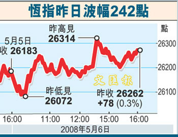 中新網5月7日電 據香港文匯報報道,港股繼續牛皮發展,恒指全日收報26262點,升78點,成交總額進一步縮減至702.7億元。證券經紀表示,成交再萎縮,顯示市場買盤乏力,指數上升只是中移動獨撐大市而已,而且人為因素甚強,相信若內地或美國一旦有壞消息出臺,恒指將下試25000點支持位。