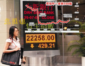 中新網(wǎng)7月30日電 據(jù)香港文匯報(bào)報(bào)道,富昌證券總經(jīng)理藺常念表示,國(guó)際貨幣基金會(huì)(IMF)唱淡美國(guó)樓市,反映美國(guó)樓市問(wèn)題未解決,加上美林再錄巨虧,需要集資85億美元。若次按問(wèn)題延續(xù),對(duì)各地股市都會(huì)有所打擊,也會(huì)影響港股表現(xiàn)。他個(gè)人仍維持看淡港股后市的預(yù)測(cè),估計(jì)恒指短期有機(jī)會(huì)下試21000點(diǎn)。