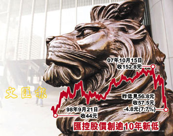 匯控單日急挫7.7%,圖表顯示其有跡象下試50元以下水平,但白韌認(rèn)為,匯控跌穿60元已經(jīng)接近底部,雖然匯控表示沒有財政壓力,但卻受制于市場,若早些宣布集資,反而可掃除其不明朗因素。7天以來匯控股價已下跌23%,市值因而蒸發(fā)2062億元。