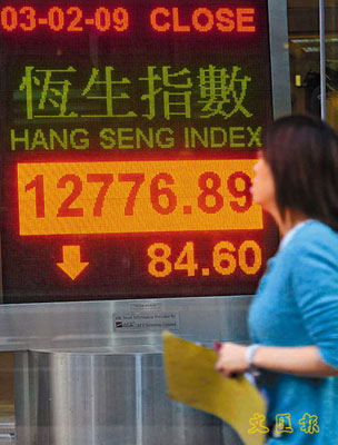 中新網2月4日電 據香港《文匯報》報道,港股3日再一次由升轉跌,早高開130點后,在高位反復徘徊,最高曾見13065點,但午市后升幅開始收窄,最多跌逾130點,全日收報12776.8點,跌84.6點,成交額進一步縮減至353.16億元。