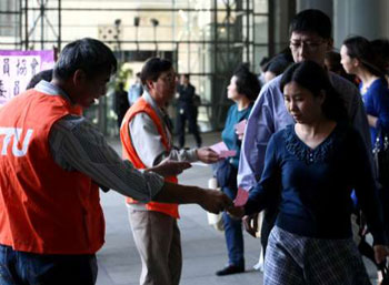10名工聯(lián)會(huì)和銀行業(yè)雇員協(xié)會(huì)代表9日在午膳時(shí)間,在匯豐總行向匯豐員工派發(fā)傳單,呼吁員工如被裁員和受到不公平的對(duì)待,可致電向協(xié)會(huì)求助。