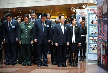 12日下午2時28分,香港文化中心一片肅穆。在參觀“蜀港同心大愛無疆──汶川大地震一周年紀念圖片展”后,曾蔭權與高祀仁連同駐港部隊司令員張仕波少將、中聯辦副主任李剛、外交部駐港副特派員詹永新、政制及內地事務局局長林瑞麟、民政事務局局長曾德成和勞工及福利局局長張建宗等一眾嘉賓,一同肅立默哀一分鐘,哀悼汶川大地震遇難同胞。