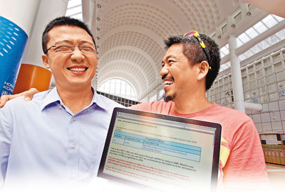 黃榮新(左)獲嶺大會計系錄取大笑得見牙不見眼。旁為其恩師陳兆焯。(圖片來源:文匯報)