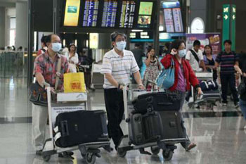 抵港機場旅客戴上口罩預防甲型流感。(圖片來源:大公報)