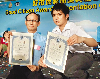 15歲的容啟聰(右)與老師胡文安(左),協助警方追捕盜竊罪犯,獲頒好市民獎。(圖片來源:文匯報)