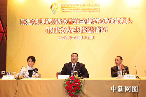 中新網(wǎng)7月16日電 第三任澳門(mén)特區(qū)行政長(zhǎng)官候選人崔世安昨日與博彩管理暨中介人總會(huì)座談。