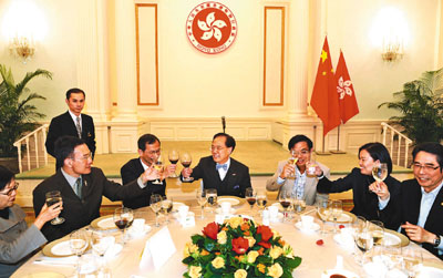曾蔭權(quán)5日在禮賓府筵開5席,來自各黨各派的約40名議員依時赴會,財政司司長曾俊華、律政司司長黃仁龍及大部分局長和副局長也同為座上客。據(jù)引述,曾蔭權(quán)在午宴上致辭時向議員們笑說,議事之外都有人情,火花之外都有風(fēng)花雪月,5日的宴請是希望大家除了公事之外,也有多些溝通和交流。