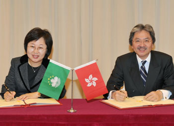 24日,香港財政司司長曾俊華及澳門政法務(wù)司司長陳麗敏在香港簽署了《中華人民共和國香港特別行政區(qū)政府與中華人民共和國澳門特別行政區(qū)政府關(guān)于持永久性居民身份證入出境及互免填報入出境申報表協(xié)議》。這標(biāo)志港澳兩地在出入境事務(wù)方面的合作進(jìn)入新的階段。