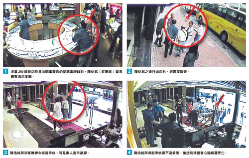 陳佑銘女兒陳怡透露,事發(fā)當(dāng)日(22日)其父被鄭姓導(dǎo)游要求在紅磡JW Jewellery Outlet Limited珠寶店逗留至少2小時(shí)。由于珠寶店大門關(guān)上、樓底矮、人多又沒座位,他感到局促,在店內(nèi)逗留半小時(shí)后到店外透氣,20分鐘后鄭導(dǎo)游要求他回到店內(nèi)。陳怡說:“當(dāng)時(shí)父親表明自己身體不適,又有心臟病,導(dǎo)游反而搶白父親是以病威脅,令老人家非常氣憤。”陳佑銘于口角期間病發(fā)暈倒,送院后證實(shí)死亡。