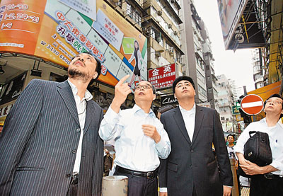 六月九日,腐蝕性液體傷人事件發(fā)生后,香港警方繼續(xù)對旺角奶路臣街與西洋菜南街交界處的幾棟嫌疑樓房進行布控,進一步排查疑點,大批香港媒體亦在現(xiàn)場跟蹤報道。 中新社發(fā) 鄭祚聲 攝