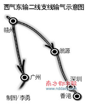 中國石油天然氣集團天然氣與管道分公司副總經理侯創業在上周的會議上透露,西氣東輸二線干線管道從新疆霍爾果斯口岸入境之后,經獨山子、烏魯木齊,在紅柳與西氣東輸線路重合,然后向東經酒泉、山丹、武威,在寧夏中衛過黃河后與西氣東輸一線線路分開,向東南經西安、南昌、贛州,到達廣州。干線全長4945公里。據了解,在8條支干線中,有三條與廣東有關。分別為廣東翁源-深圳(香港)、廣東廣州-廣西南寧、廣東肇慶-湛江(海口)。