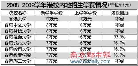 香港浸會大學內地本科生學費從去年的6萬港元增至8萬港元,增加超過三成。而香港教育學院、香港嶺南大學的學費標準也由每年6萬港元升到7萬港元。目前已經(jīng)公布今年內地招生計劃的高校中,也有高校的收費標準維持不變,如香港大學、香港中文大學、香港科技大學、香港理工大學。但是,香港大學將內地生預繳費用從1.5萬港元增至3萬港元。
