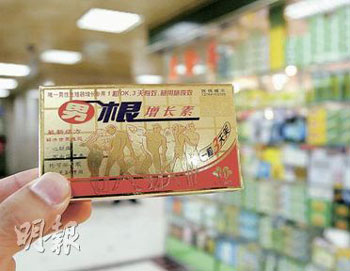 其中聲稱“1粒OK 三天有效……可增長陰莖”的壯陽藥“男根增長素”,因非法含有昔多芬及格列本脲,除在香港導致一名老人昏迷外,也曾在內地多個省被政府查禁。