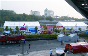 位于收容災區民眾最多的九洲體育館內的帳篷學校于上月19日開學,供2000多名來自北川、安縣等重災區的孩子上課,他們成為地震后災區首批復課的中小學生。