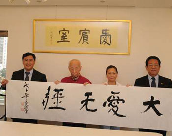 圖:饒宗頤(左二)所寫的“大愛無疆”,由高佩璇(左三)以500萬元義購,一同為救災盡一分力。(圖片來源:大公報)