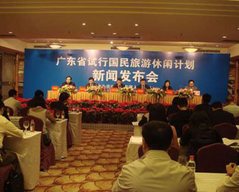 廣東省有關部門23日召開新聞發布會,公布試行國民旅游休閑計劃的實施細則,圖為發布會現場。(圖片來源:大公報)