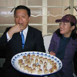 圖:在灣仔船街18號經營的“鴛鴦飯店”主打有香港本土特色的懷舊菜,市建局主席張震遠品嘗蘿卜糕后激贊叫好,飯店老板徐蒝眉開眼笑。(圖片來源:大公報)