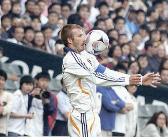 在上海站拉傷右腿的貝克漢姆9日仍以正選上陣,踢足90分鐘,包辦所有角球及罰球,也不時(shí)在右路施展“七旋斬”威力,每逢貝克漢姆一拿球,即引來(lái)球迷狂呼,有的更大喊“David!David!”。