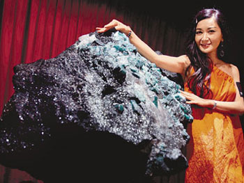 資料圖:港姐楊洛婷在香港抱趣堂藝術館內向傳媒介紹綠寶石原生礦。當日,該館展示法國留尼旺島開采出來的,一個重達五百三十六公斤,長達一百二十五厘米,闊七十八厘米及高五十五厘米的綠寶石原生礦。據稱,該礦石是目前世界上最大的寶石原生礦。 中新社發 洪少葵 攝