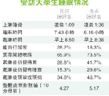 據香港明報報道,中大醫學院在06年2月至3月訪問了400名中大學生了解其睡眠習慣和質素,發現多達57.5%屬于“差劣睡眠者”(poor sleeper)。當中女性更占65.7%,此班學生平均每晚到凌晨1時半才睡,近半數人起床后會感到頭暈或頭痛,四成起床后仍覺累,絕大多數均要靠鬧鐘喚醒。