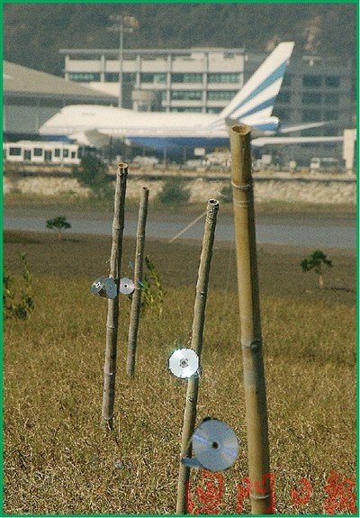 民署為免雀鳥在堆填區(qū)和淺灘覓食,到處亂飛而影響航班升降,18日上午派出工程人員在堆填區(qū)架設(shè)由回收光盤組成的反光裝置。該反光裝置由四片組成一個三角錐體,再以一條魚絲懸空吊在竹枝上,反光裝置可隨風飄揚,將陽光向四周折射,干擾雀鳥活動,從而驚嚇雀鳥。