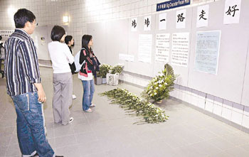 昨晚六時,十多名科大內地生于學生會門外,自發(fā)性為葛煒煒舉行簡單的悼念活動,不少學生獻上鮮花悼念,并于墻上寫上“煒煒,你一路走好”的悼文,其中一篇署名為“你的大哥—葛惟昆”的悼文提及:“你怎么這樣就走了……但我知道,你一定隱藏著巨大的痛苦,不可言狀的痛苦,一想到這,我的心更痛,悲哀和自責讓我無法平靜。”