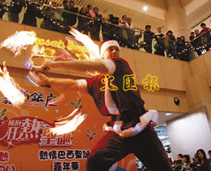 據香港文匯報報道,25日天水圍商場嘉湖銀座舉行了“圣誕火熱勁舞show”,邀請來自澳洲的火焰舞蹈團到香港表演。3人組成的表演隊伍手持煙火,做出一系列高難度動作,包括跳舞、噴火、玩呼拉圈和踩高蹺,吸引在場大批小朋友拍手大笑和爭相與他們合照。