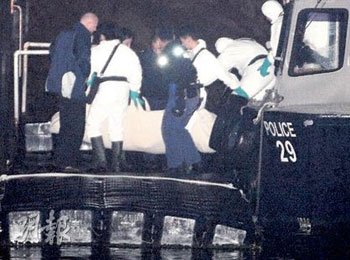 穿上連帽白袍的“災難遇害者辨認小組”探員26日晨到沉船現場協助,事后協助把兩具船員尸體抬上岸,再舁送殮房等候剖驗。(圖片來源:明報)