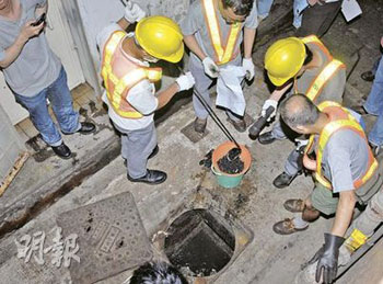 但街坊稱,兇案現(xiàn)場樓下的地產鋪和牛仔褲鋪的污水渠,近日傳出如“死老鼠“般惡臭。渠務署職員8日與探員到石硤尾現(xiàn)場一帶的沙井搜查,探員倒入化學顯影劑后利用弧光燈搜索,撈起兩團懷疑碎肉,又收集了4盆淤泥,全部帶返警署調查。