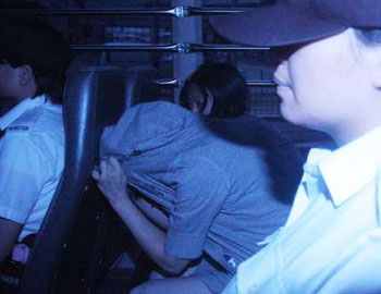 圖:女被告黃慧心12日在囚車上蒙頭閃避記者鏡頭。(圖片來源:大公報)